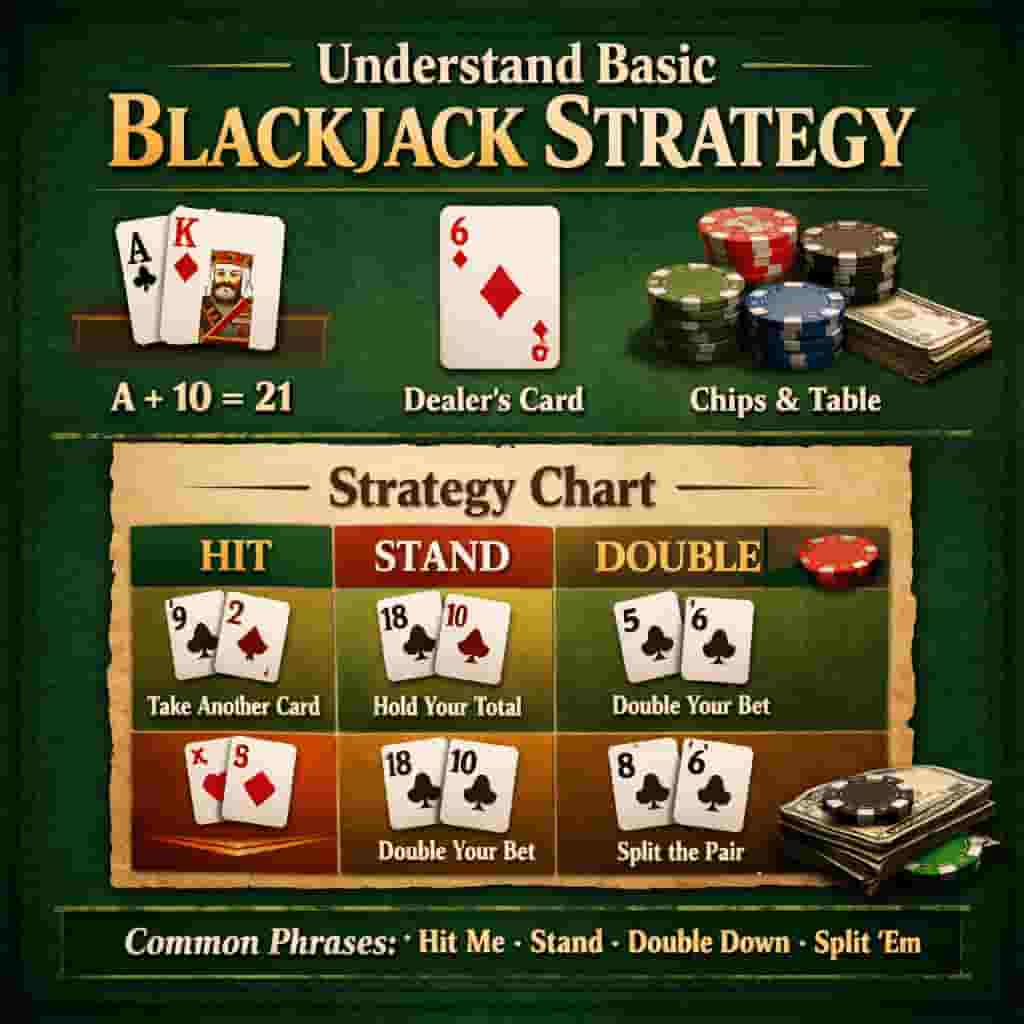With this knowledge, you can develop a strategy chart that tells you when to hit, stand, double, or split. You should also memorize table phrases; they help you make quick decisions.